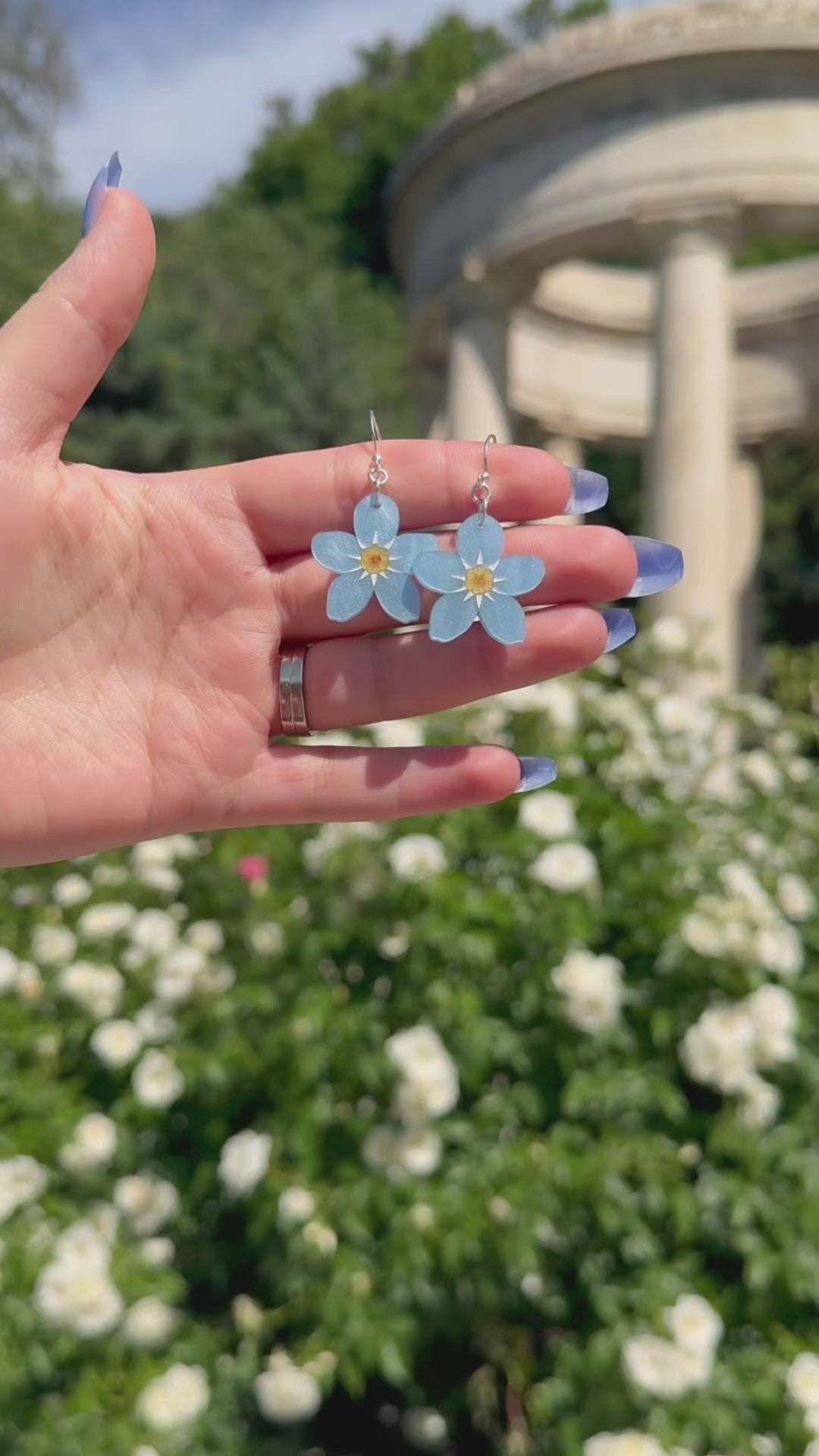 Add a touch of whimsy to your look with our forget-me-not earrings. These hand-painted, shimmering flowers add a beautiful, feminine touch to any outfit.