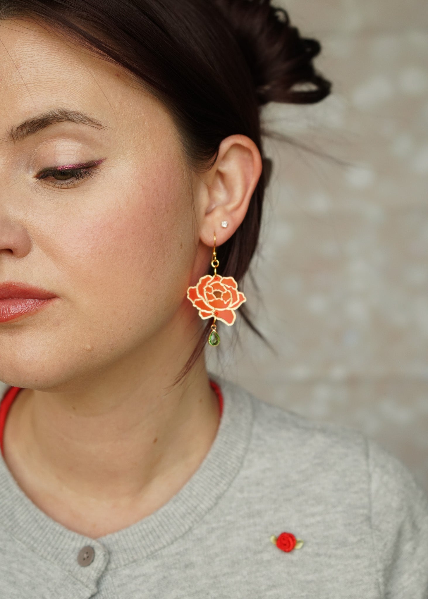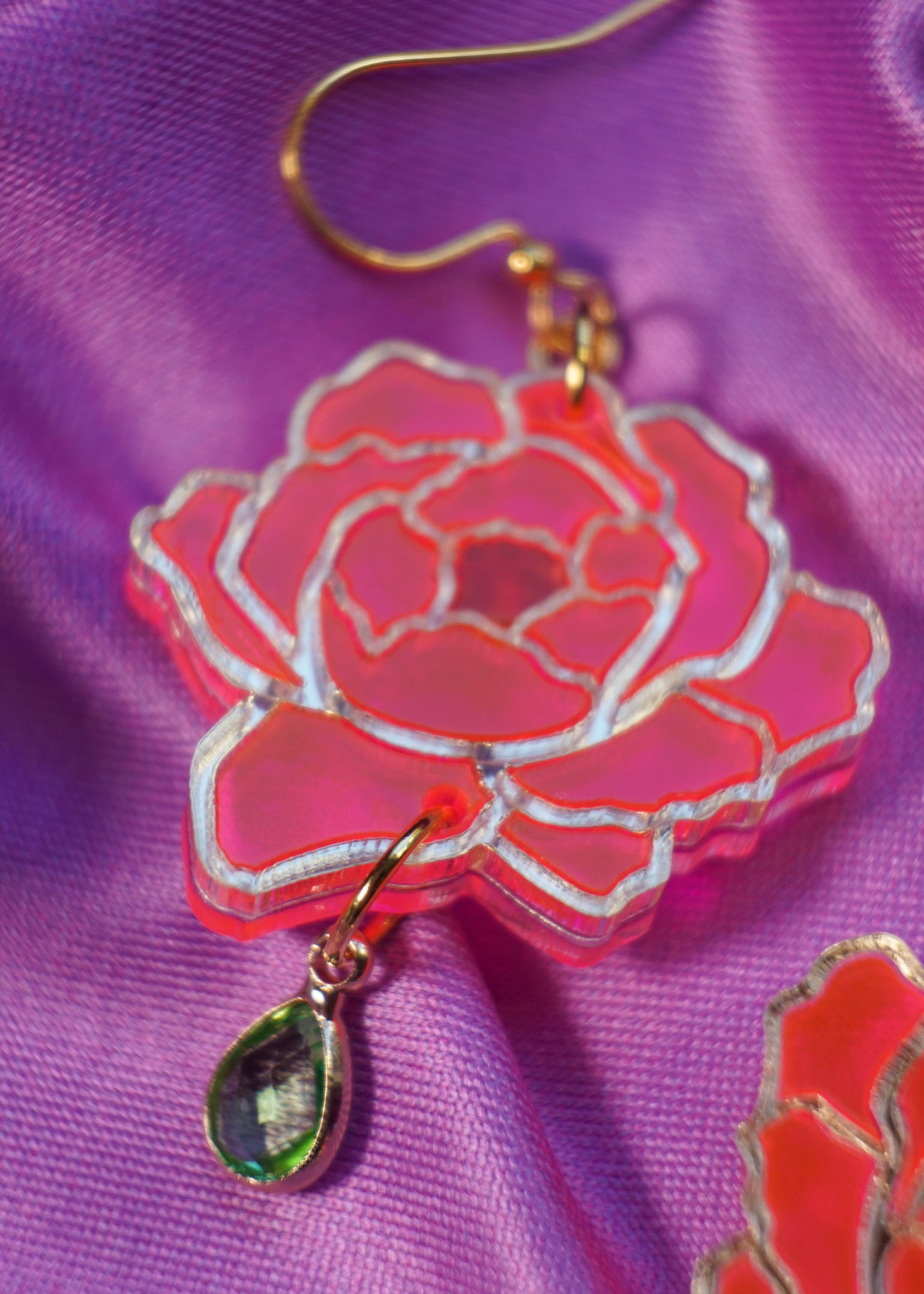 Featuring vibrant neon acrylic, these beautiful peony earrings were inspired by stained glass designs. Lightweight and hypoallergenic, they're your new go-to for all-day wear. *Not actually made from glass... other than the green crystal charm*