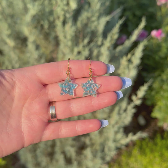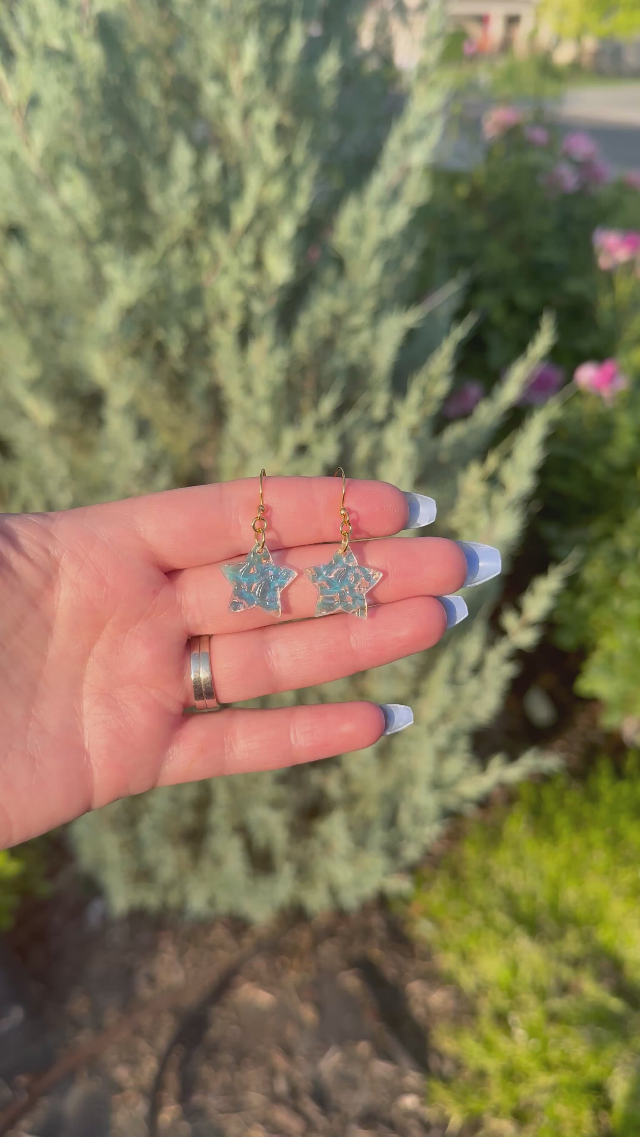 These playful iridescent star earrings are made from ripple acrylic that catches the light with a dazzling shimmer. Lightweight and eye-catching, they add a fun, celestial sparkle to any outfit. Perfect for those who love a touch of whimsy in their accessories.