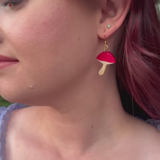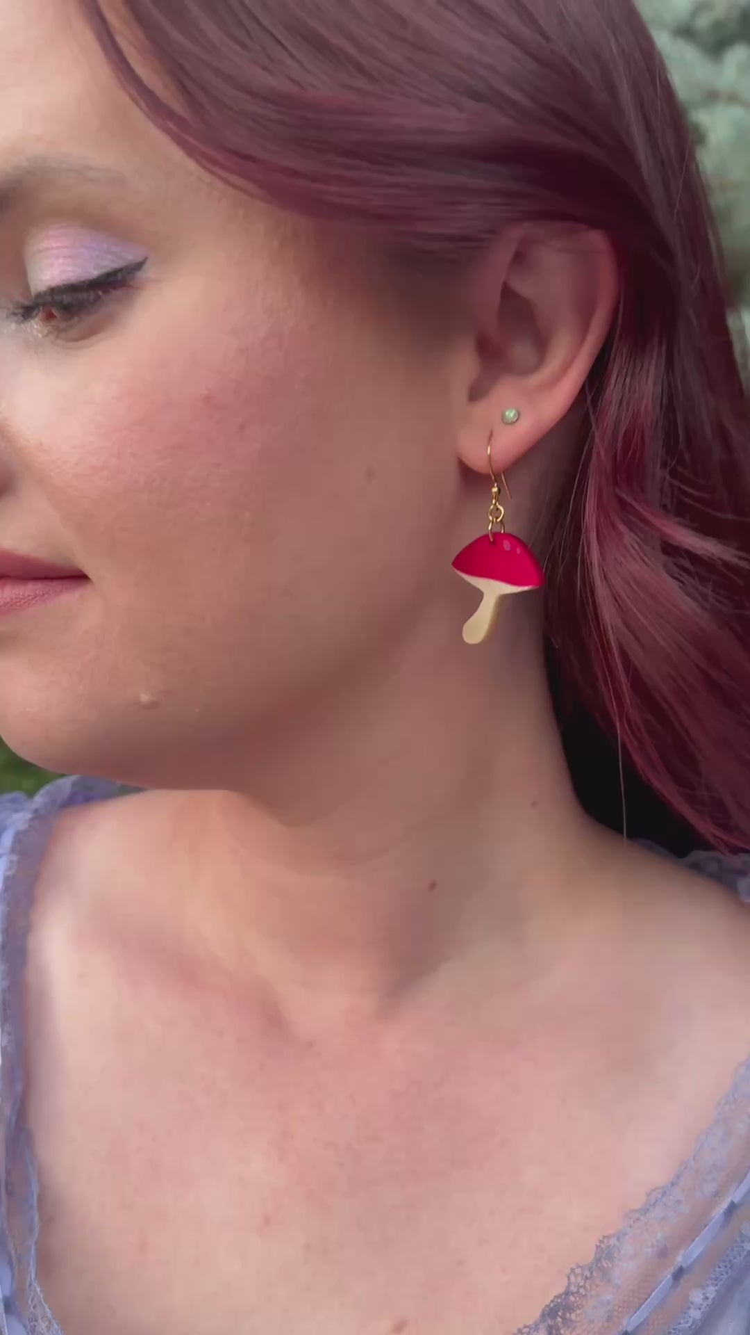 Add a touch of whimsy to your look with our mushroom earrings. Featuring shimmering red caps, they bring a fun pop of color and charm to any outfit.