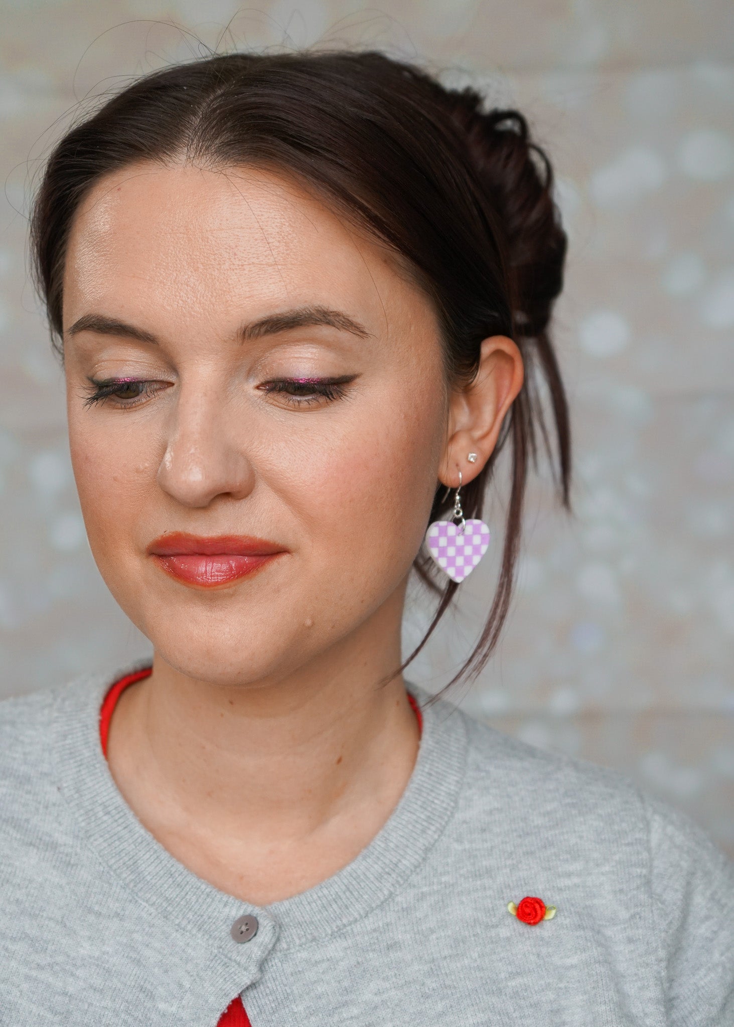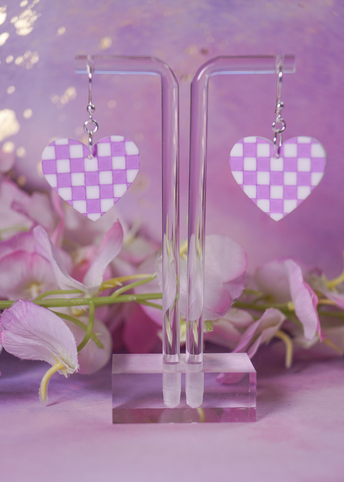 Adorable hand-painted checker hearts in purple and white that'll make you smile every time you catch your reflection. Super lightweight so you can wear them all day without any fuss, and hypoallergenic materials mean no irritation—just pure joy!