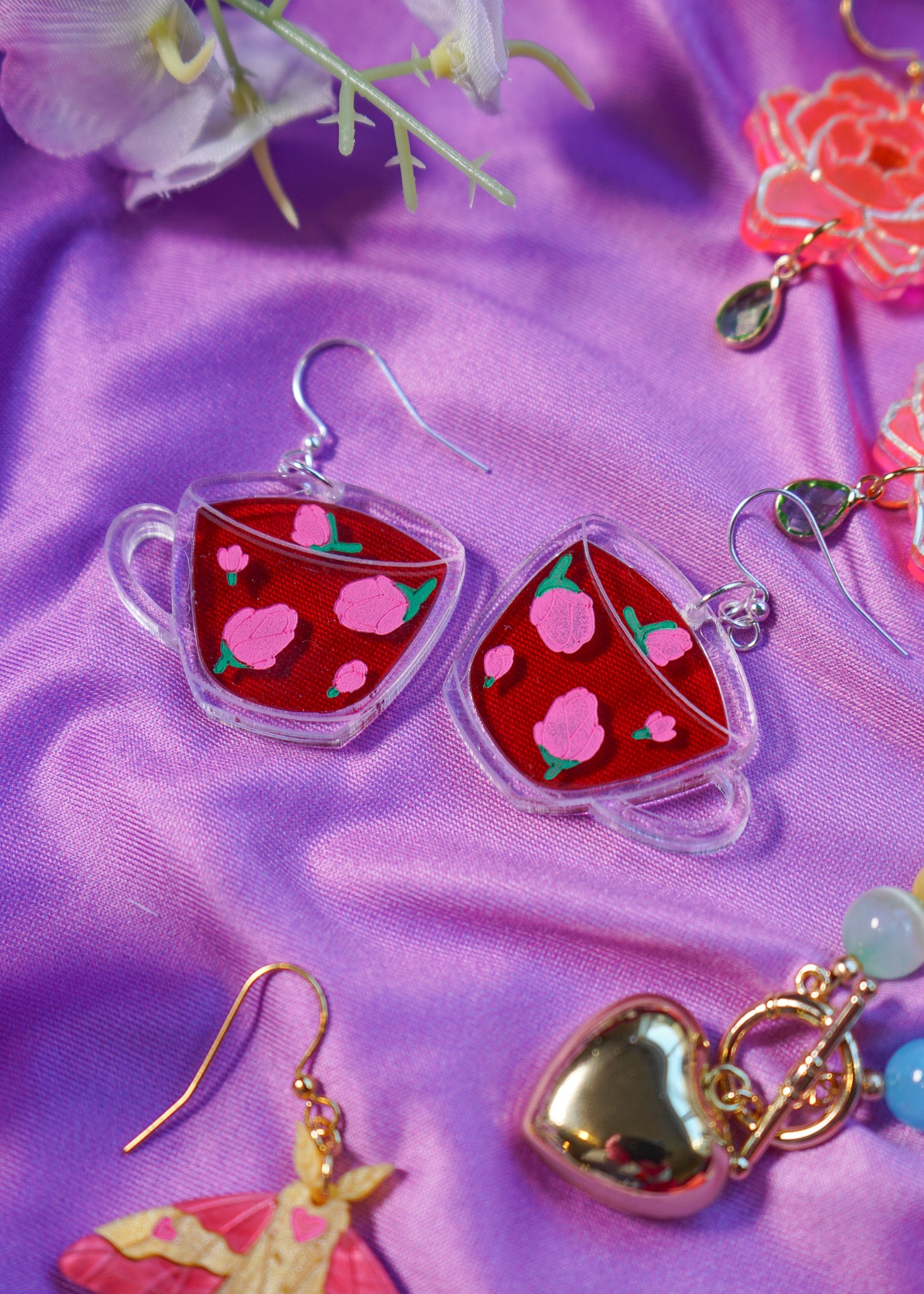 Brew up some romantic feelings with these beautiful earrings! Features hand-painted engraved flowers on translucent acrylic. Lightweight and hypoallergenic, they're gentle enough for all-day wear without any fuss. These whimsical earrings ideal for Valentine's Day or any other time!